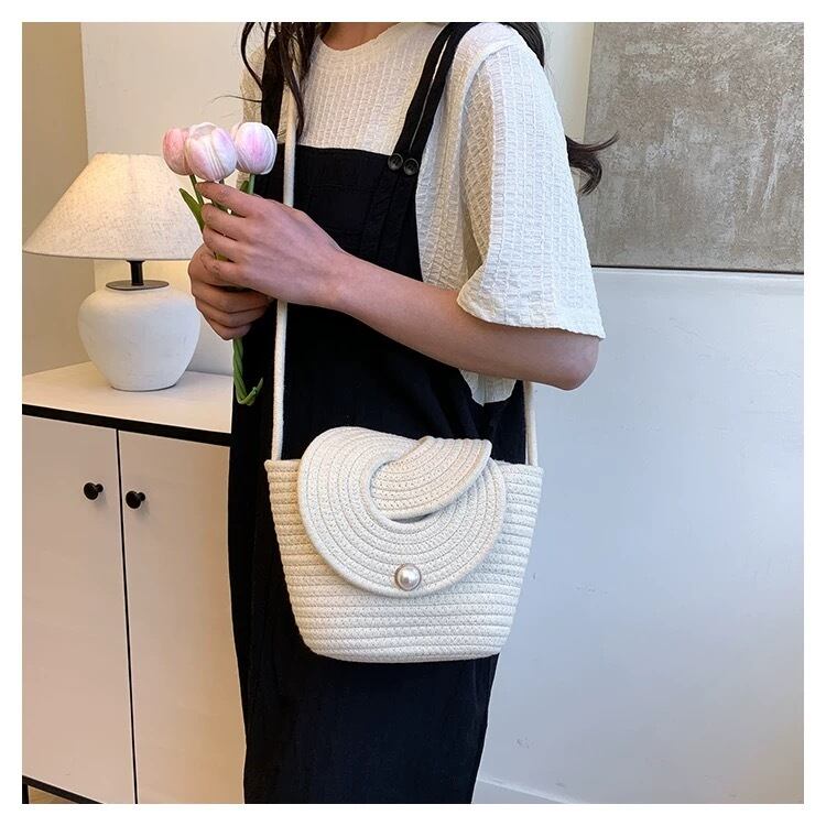 曲線が美しいフラップデザインが特徴のショルダーバッグ。ナチュラルな風合いのロープ調素材とパールボタンが上品で、カジュアルにもきれいめコーデにもぴったり。ちょっとしたお出かけやデートにもおすすめのアイテムです。