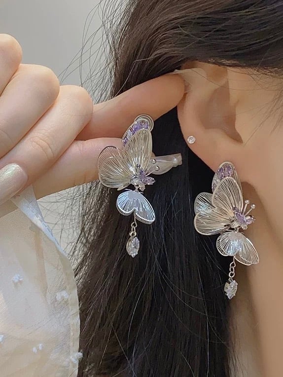 繊細な金属線で形作られた蝶の羽が、光を受けてきらめく上品なピアス。軽やかに揺れるクリアストーンが耳元に透明感を与え、エレガントな印象を演出します。